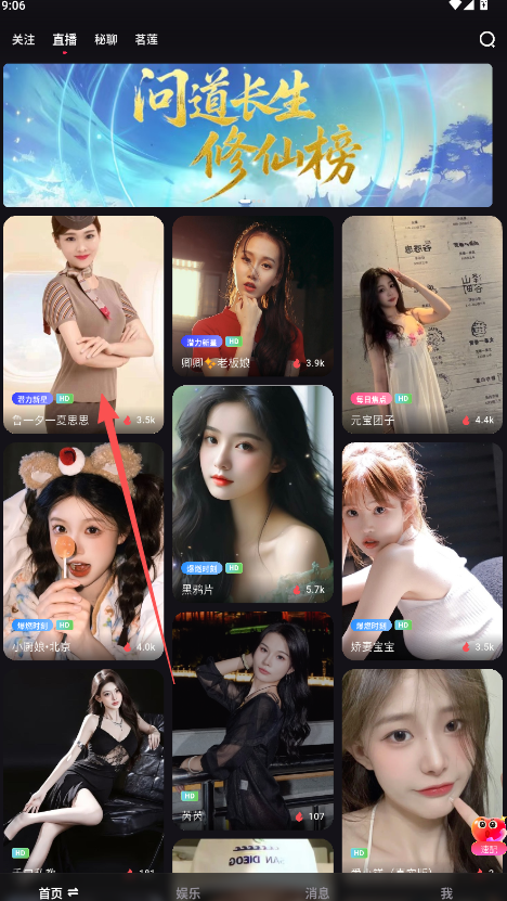 關(guān)注以后來到首頁,選擇你喜歡的主播類型點(diǎn)擊免費(fèi)觀看。