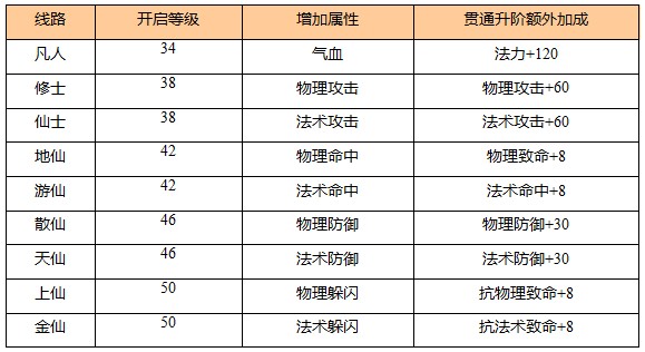 每條修仙線路開啟等級不同,所增加屬性也不相同。