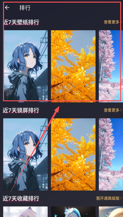在瀏覽排行頁面,能看到近期熱門的壁紙和鎖屏樣式,點擊“查看更多”可探索更多相關內容,不過收藏排行需要高級版權限才能查看。