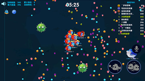 游戲里除了基礎的方向操控外,還有兩個關鍵操作:吐球和分裂。吐球指的是朝指定方向發射一顆能量球,需要付出損失部分體積的代價。這顆能量球能被任意玩家吸收并轉化為自身能量。在實際對戰中,它可以用來快速整合分裂后的能量、推動海膽躲避危險,甚至當作攻擊方式來運用。