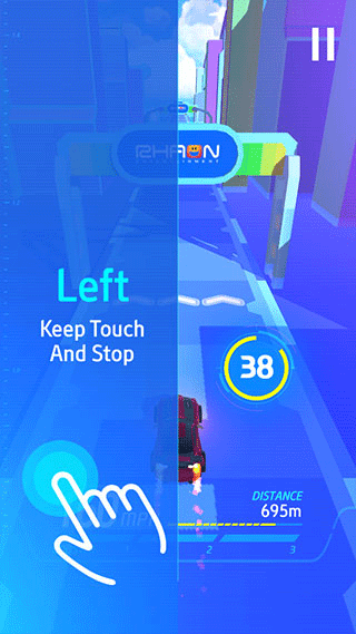確認準備工作全部完成后,點擊“play”按鈕進入賽道,通過長按屏幕的左右區域來操控賽車的行駛方向。