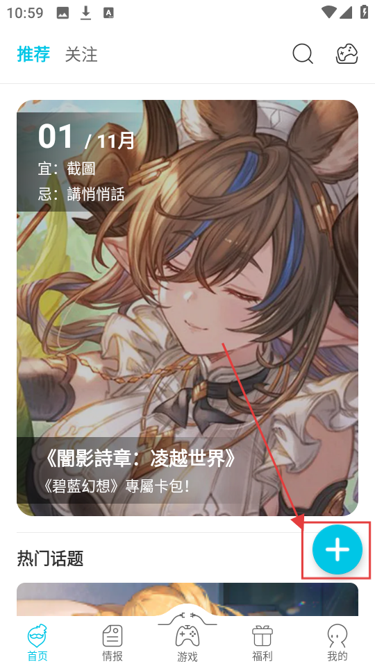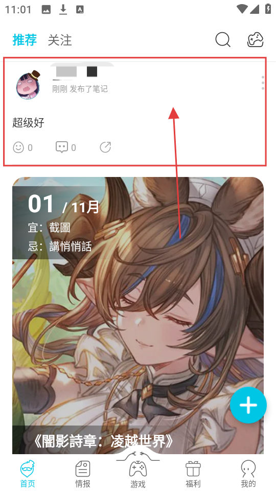 在首頁點擊藍色的【+】號按鈕,就能進入發布筆記的頁面,把你的游戲心得分享出來啦。