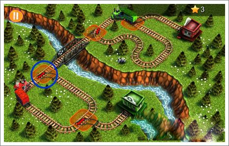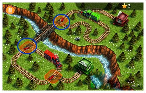 游戲啟動后,點擊兩個藍色圓圈所在的位置,引導兩列火車各自駛入空閑區(qū)域,之后需等待恰當?shù)臅r機再執(zhí)行后續(xù)操作。
