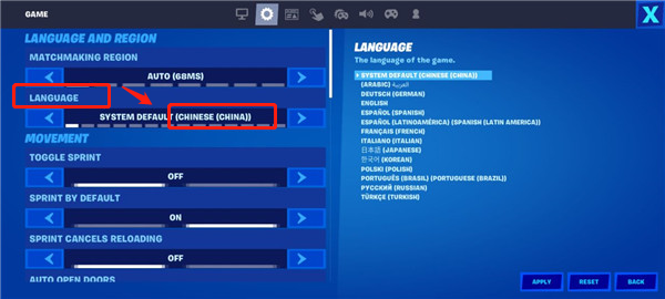 找到“語言”(LANGUAGE)選項,選擇“系統默認 { 中文(中國)}”——也就是簡體中文模式。