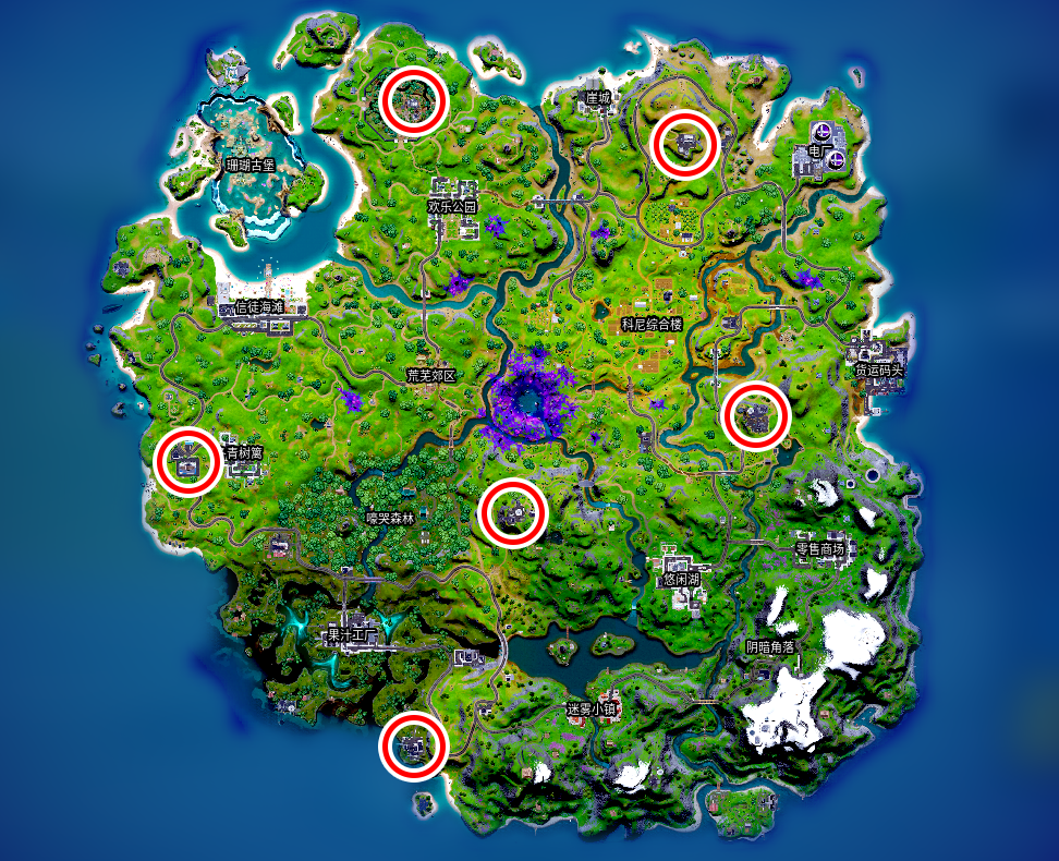 五個間諜基地的位置可參照下圖,而“陣營鎖定寶箱”其實就是被封印的箱子,要打開它的話,得通過電話亭變身,或者先擊敗附近的守衛再進行掃描才行。