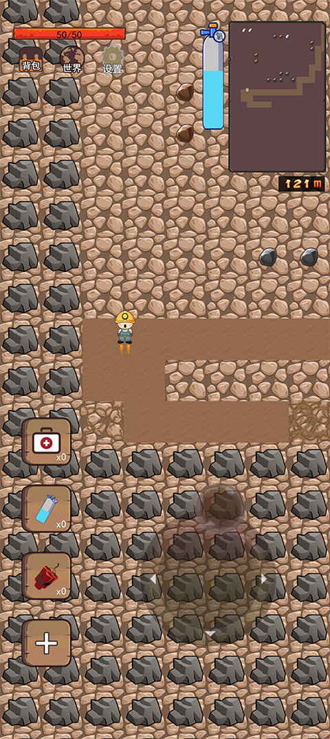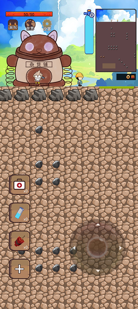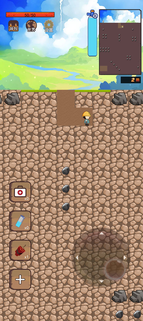 通過(guò)操控右下角的搖桿,能夠靈活調(diào)整角色的移動(dòng)方向。向下滑動(dòng)搖桿時(shí)角色會(huì)向下挖掘,向右滑動(dòng)則執(zhí)行向右挖掘動(dòng)作,向上滑動(dòng)搖桿時(shí)角色便會(huì)進(jìn)入飛行狀態(tài)。