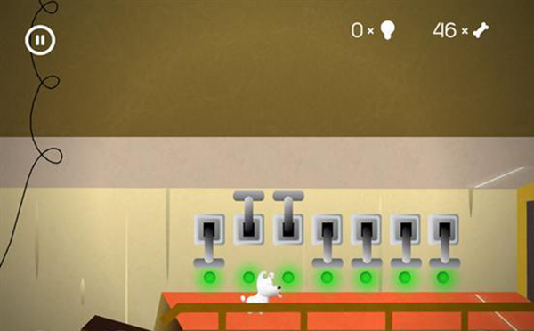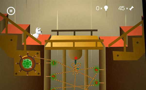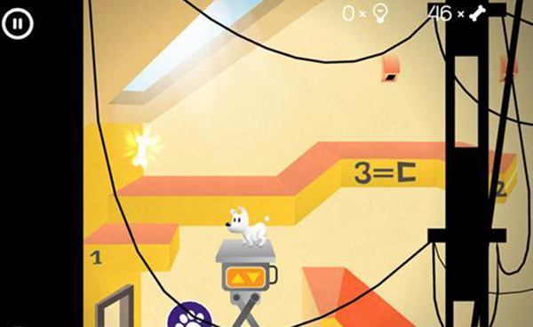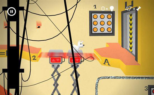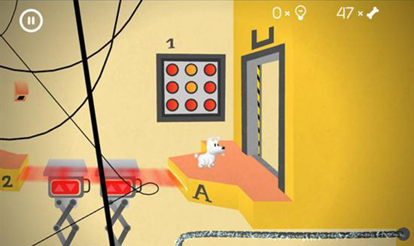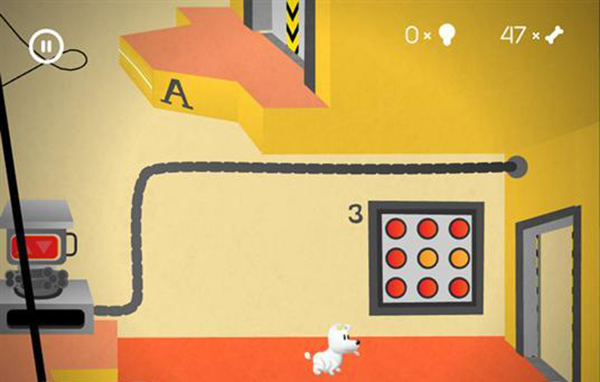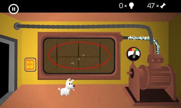 進入下一個房間后,讓米皮跳到彈簧臺階上,用觸屏點擊彈簧來控制它移動,朝著有骨頭的方向向左移動。