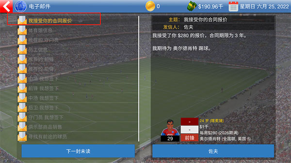 最后在收件箱中查看,若球員接受報價即表示購買成功。
