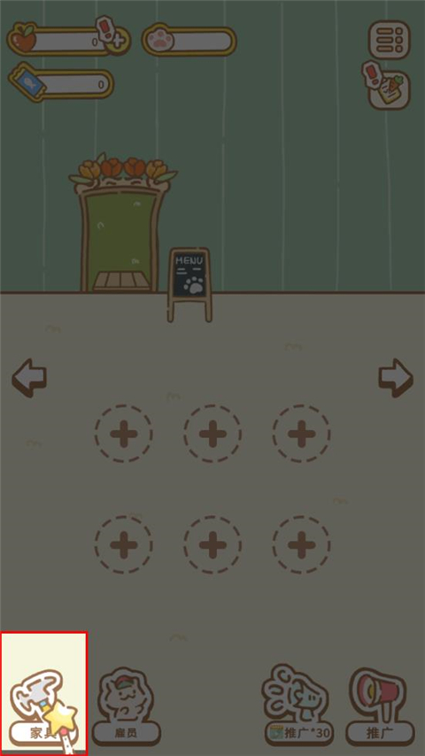 1、玩家在進入游戲之后,店里面什么都沒有,需要先購買一些家具。