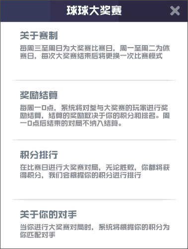 大獎賽每一周為一個比賽周期,每周的周三到周日是比賽日,周一和周二則是休賽日。每次大獎賽結束后,比賽模式都會更換一次。球寶們參賽的時候要留意比賽時間以及當周的比賽模式,可別錯過了呀~