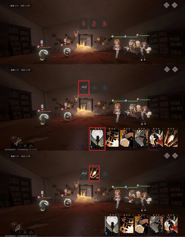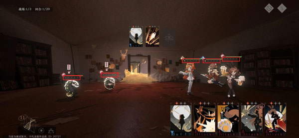 每回合的行動次數(shù)由在場人數(shù)決定。從圖中能看到,我方當前場上有三個人,因此本回合我們能行動三次。每次選擇使用卡牌或者移動都要消耗一點行動點。