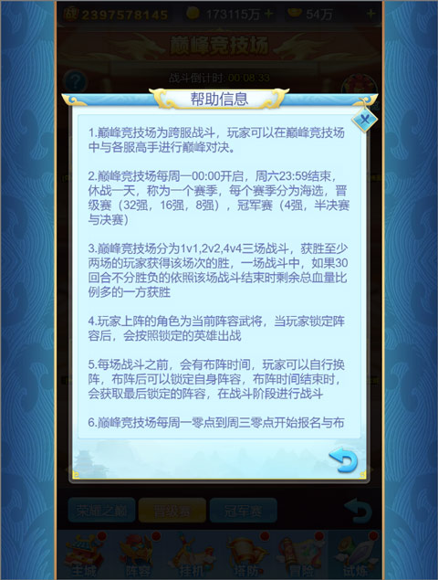 巔峰競技場包含三場對決,分別是1v1、2v2和4v4模式。玩家只要在這三場里贏下兩場或三場就能獲得最終勝利。1v1時建議選用單挑能力出色的英雄;若一場戰斗打滿30回合仍未分出勝負,則根據雙方剩余血量比例判定,比例高的一方獲勝。而在2v2或4v4模式中,也可以選擇生存能力較強的英雄。