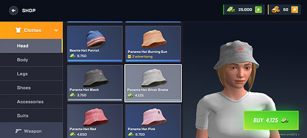 點擊左側的“Clothes”選項,即可選購頭飾、衣服、褲子、鞋子以及武器等各類裝備。