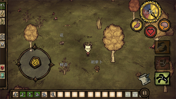 游戲正式開始后,左側(cè)區(qū)域用于操控角色的移動方向,右側(cè)則負(fù)責(zé)資源收集功能。玩家需要盡可能收集所有可利用的資源,以此來應(yīng)對饑荒的威脅。