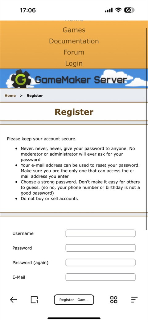 按照紫色方框里給出的網址,在瀏覽器中輸入以下地址:gamemakerserver.com/en/register。