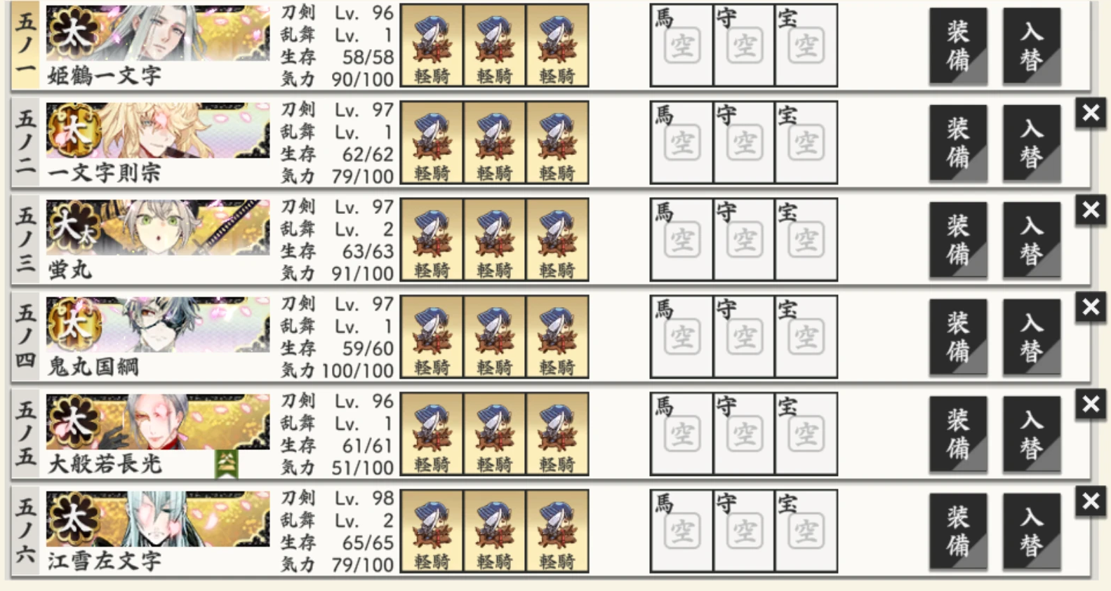 我個人不想經(jīng)歷短刀痛苦的練級過程,所以先把短刀用糖喂到30到40級,接著去4-3練到50級,之后就直接放進(jìn)6圖夜戰(zhàn)里升級了。