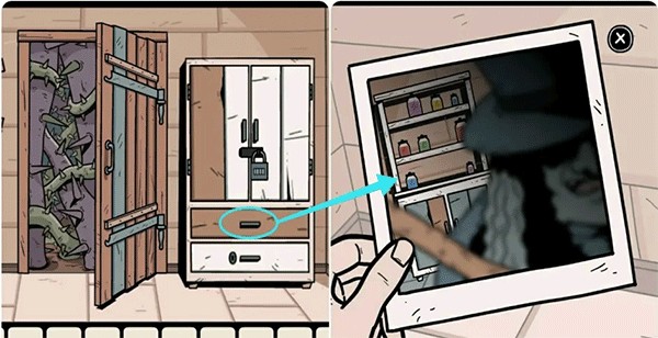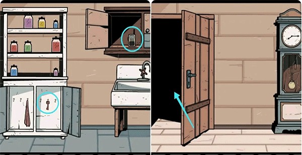打開那扇藍色的門進入盥洗室,依據照片上的提示來擺放架子上的罐子,完成這一步后拿走下方的鑰匙,隨后打開水池上方的柜子取出對講機,之后出去用鑰匙打開鐘表左側的門。