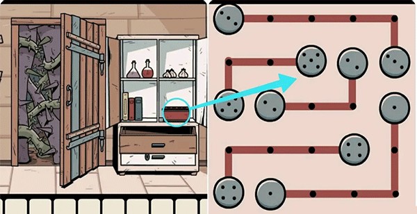 輸入符號密碼打開正大門右側的柜子,接著點擊右下方的紅色盒子完成其上的連連看機關,就能取出里面的白色寶石。