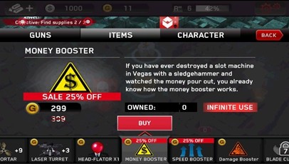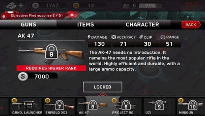 商店里有主副武器、功能性物品,還有能回血的繃帶之類的東西。購買方式分游戲幣和金幣兩種。等等級提高了,會解鎖更高級的槍支和裝備。新手玩家一開始只有一把槍,得趕緊升級、多賺點錢買槍,這才是能變成厲害角色去完虐僵尸的唯一辦法?。瓤?,不過說真的,真正愿意花錢的玩家還是直接用金幣買的~我們這些普通玩家可比不上人家呀…)