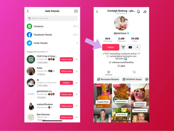 把TikTok和其他應(yīng)用關(guān)聯(lián)起來(lái),或者授權(quán)它訪問(wèn)你的聯(lián)系人列表,TikTok就會(huì)為你推薦可關(guān)注的好友。此外,你也能關(guān)注行業(yè)內(nèi)的其他品牌賬號(hào),這樣既能從中汲取靈感,也有助于拓展自身的人脈資源。