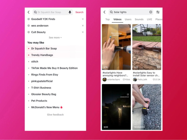 在“發(fā)現(xiàn)”頁(yè)面,你能按類(lèi)別瀏覽TikTok的各類(lèi)趨勢(shì)。此外,也可借助搜索欄查找熱門(mén)內(nèi)容——點(diǎn)擊搜索圖標(biāo)后,就能按照標(biāo)簽、視頻、用戶(hù)和音頻來(lái)篩選搜索結(jié)果。你還可以關(guān)注行業(yè)內(nèi)的熱門(mén)用戶(hù),從他們分享的內(nèi)容里獲取靈感,進(jìn)而把握最新趨勢(shì)。