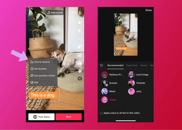● 文本轉(zhuǎn)語(yǔ)音。TikTok的文本轉(zhuǎn)語(yǔ)音功能十分受歡迎,能讓你在不使用自己聲音的情況下,為T(mén)ikTok視頻添加語(yǔ)音內(nèi)容。