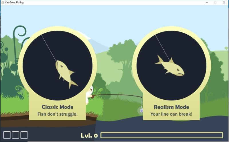 初次進(jìn)入游戲時(shí),有兩種模式可供選擇:一種是經(jīng)典模式,魚不會(huì)掙扎;另一種是寫實(shí)模式,你的魚線可能會(huì)斷裂。