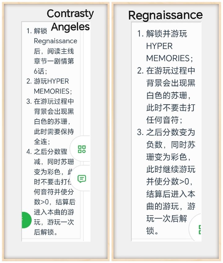 點擊處于鎖定狀態的曲目,能夠查看該樂曲的解鎖條件;一旦完成其中某一項要求,對應的項目就會被標記劃除。