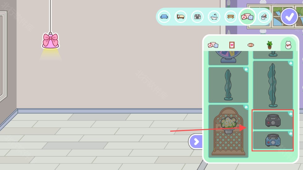 帶鎖的家具得看廣告才能解鎖,建議先解鎖【飾品】欄目最底下的兩個裝置,黑色的能讓天下雨,藍色的能讓天下雪。