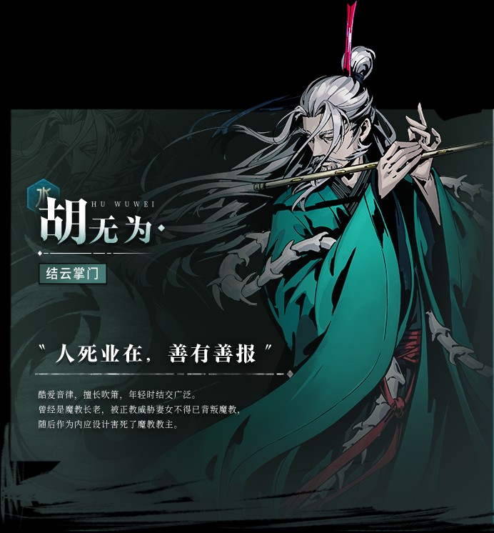 酷愛音律,擅長吹簫,年輕時結交廣泛。曾經是魔教長老,被正教威脅妻女不得已背叛魔教,隨后作為內應設計害死了魔教教主。
