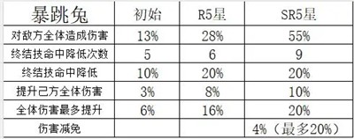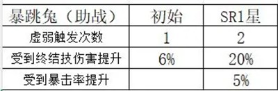 暴跳兔主戰時,主要有4種加成,其中傷害減免是升級為SR時額外增加的,終結技命中降低與提升己方全體傷害。通過升級數值提升不是很大,SR后對敵方全體造成傷害提升較大。