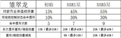 雛翠龍主戰時,主要有4種加成,其中普攻/絕招傷害減免是升級為SSR時額外增加的,終結技控制狀態命中提升與永久提升普攻/絕招傷害在SSR升級后,就不會增加數值,SSR后對敵方全體造成傷害提升也比較小。星辰建議雛翠龍主戰提升至SSR1星停止。