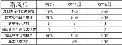 霜風狼主戰時,可以提高終結技異常狀態命中概率,回合結束清除全體異常狀態。SSR進化后,額外增加了異常狀態抗性,異常狀態命中提升與清除異常狀態概率不會再增加,對敵方全體造成傷害提升也小,星辰建議升級到SSR1星停止。