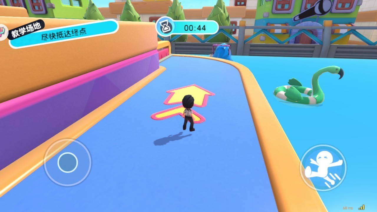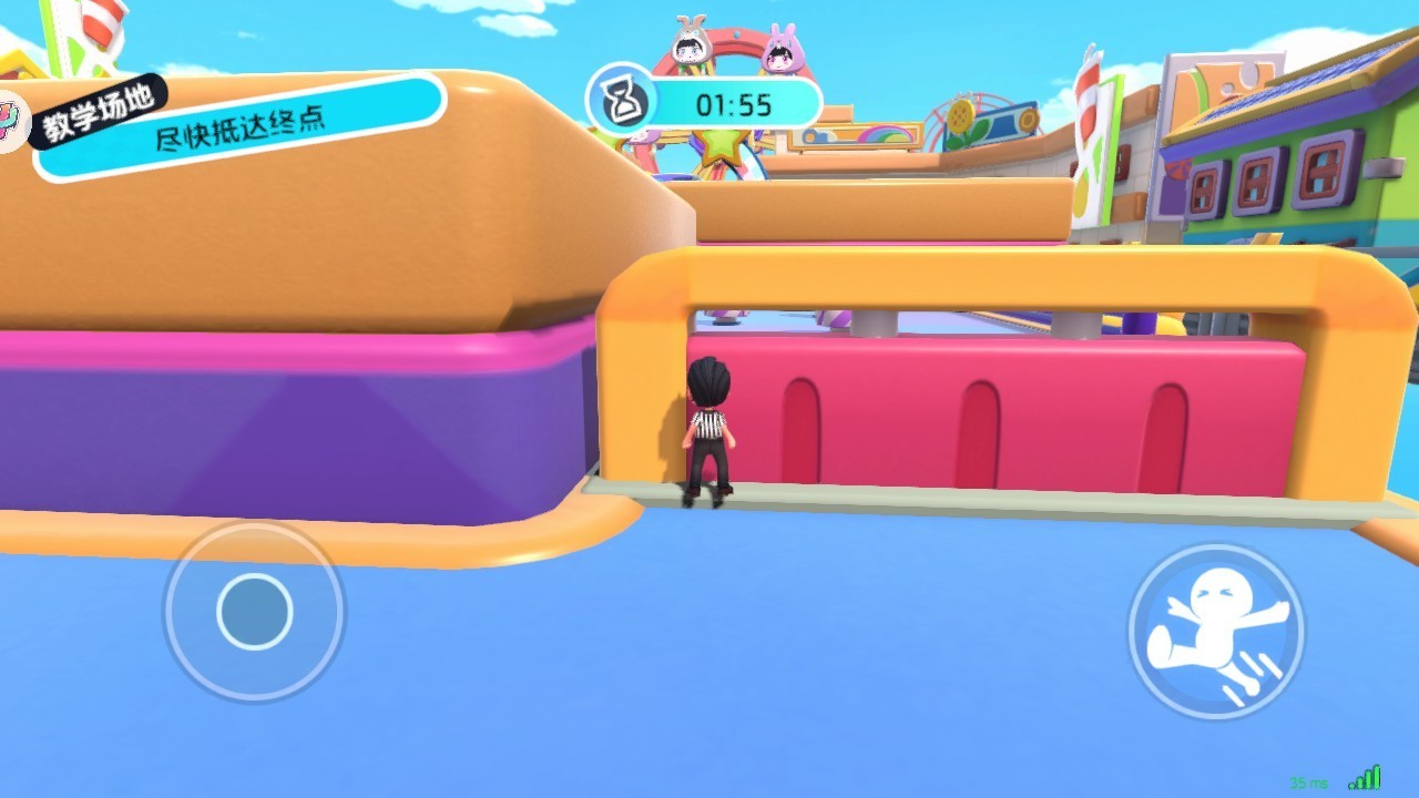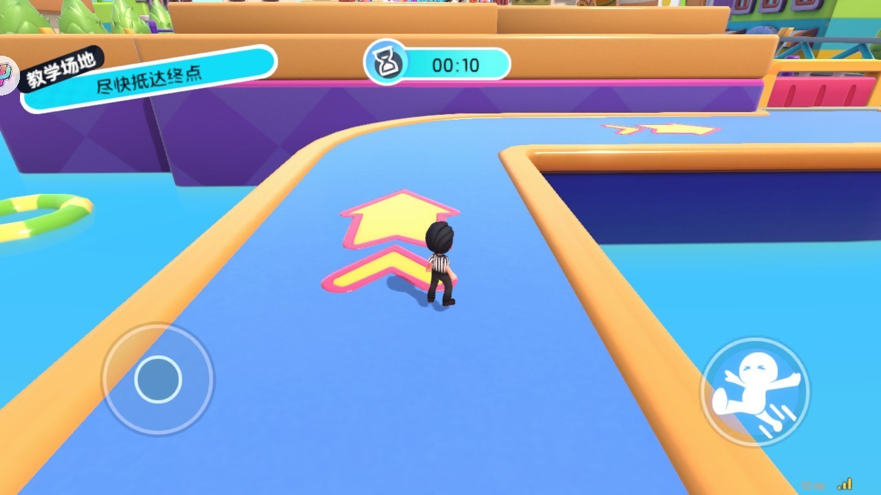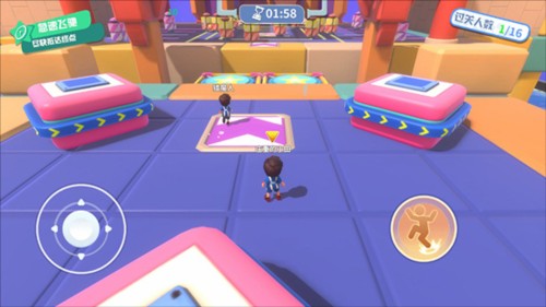 在進入地圖闖關后,玩家可以通過左邊輪盤控制人物移動,右邊按鈕控制人物跳躍,游戲每次都有三個小關卡,活到最后的人才能勝利。