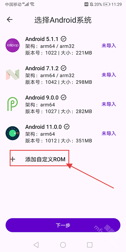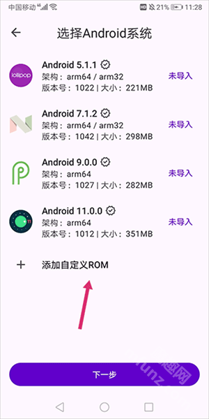 在【選擇Android系統】頁面,點擊【添加自定義ROM】選項,即可導入系統。