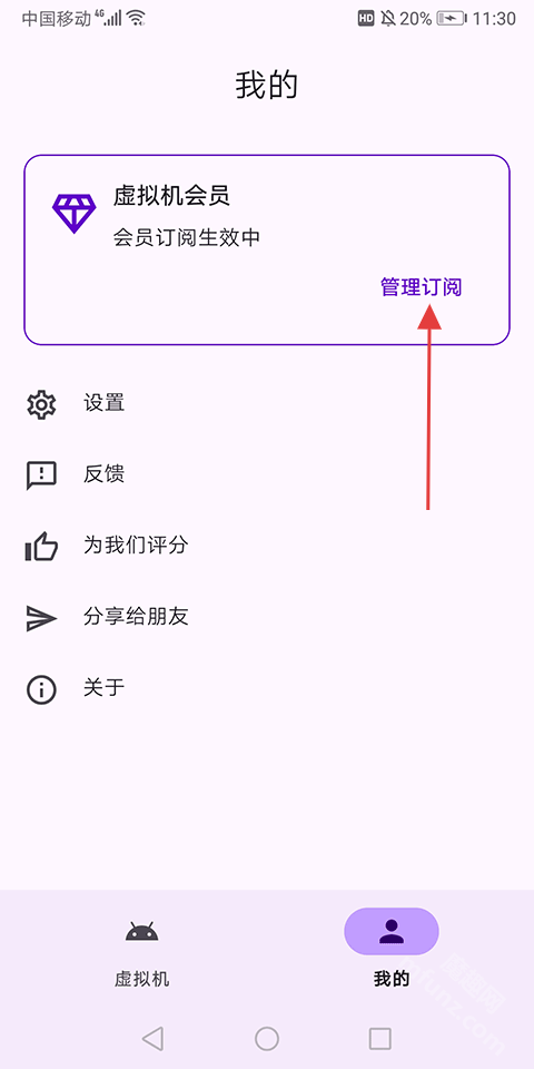 切換至【我的】頁面,點擊【管理訂閱】選項,對虛擬機會員進行管理。