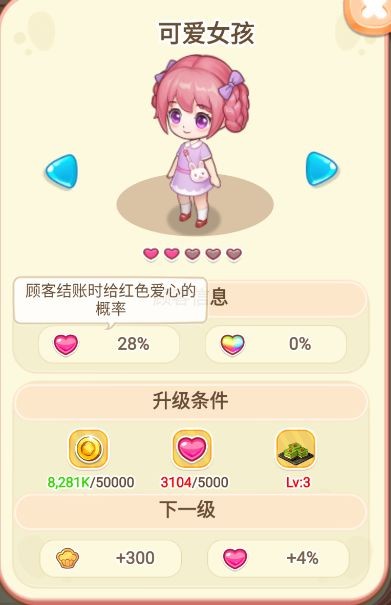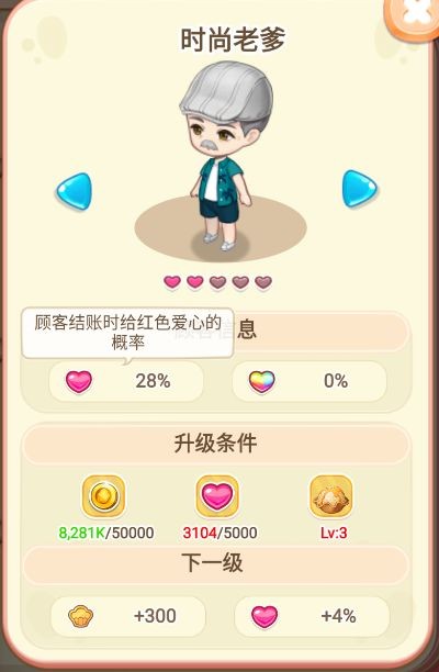 優(yōu)先升級【時尚老爹】與【可愛女孩】。能直接增加結(jié)賬時給【愛心】的概率。