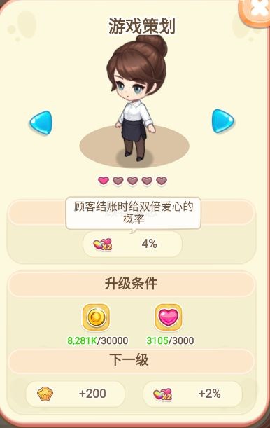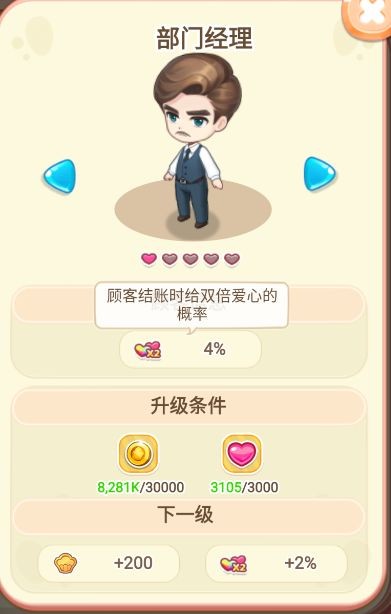 再升級【游戲策劃】與【部門經(jīng)理】。這2位【顧客】是增加給了愛心之后,翻倍的概率。