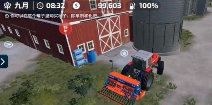 首先玩家需要前往自家宿舍后方的農(nóng)舍,先點擊定位,再駕駛播種機(jī)前往該地點,把車停到農(nóng)舍的停車光標(biāo)處,在這里可以購買種子、除草劑和化肥。點擊種子并選擇購買后,種子會自動裝載到播種機(jī)上,之后找到一塊已經(jīng)開墾好的農(nóng)田就可以進(jìn)行播種了。