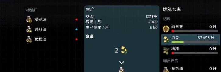 首先玩家需要準(zhǔn)備8萬資金,在商店中購買榨油廠,初期可制作葵花油、菜籽油和橄欖油這三種植物油。要是玩家前期選擇的是種植業(yè)路線,手里有不少能用來榨油的植物,那么建議盡早入手榨油廠,通常一個月左右就能收回成本。