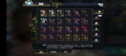 英雄分為戰士、靈能、刺客、堡壘四個種類。游戲內設有圖鑒系統,玩家可通過它查看英雄、專屬裝備、圣物等內容。