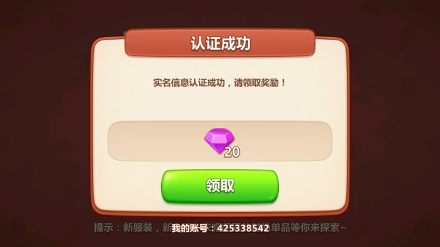 實(shí)名認(rèn)證已經(jīng)成功啦,您還可以免費(fèi)領(lǐng)取一份新人獎(jiǎng)勵(lì)——20個(gè)鉆石。