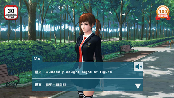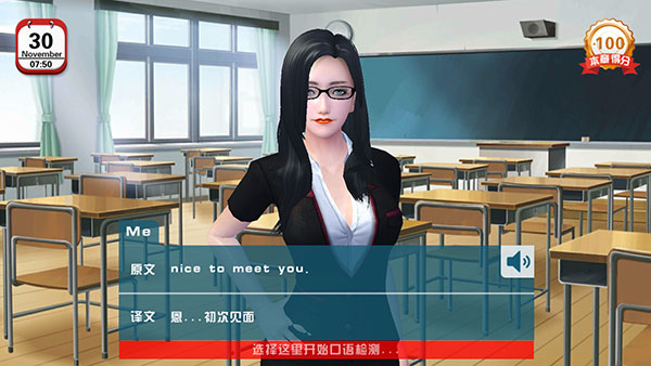 在關鍵劇情節點,玩家需要點擊下方的紅色長條按鈕來啟動錄音功能,并朗讀出上方顯示的英文對話內容。