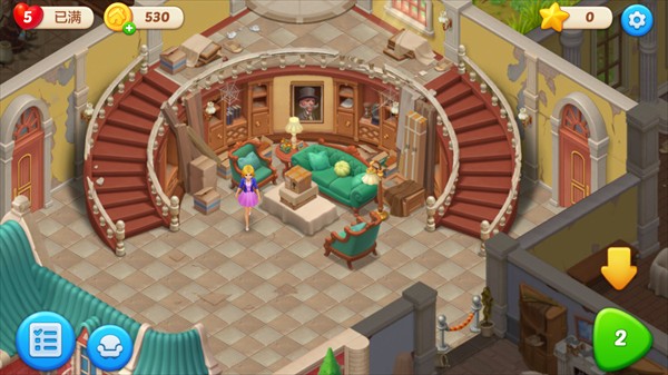 玩家進入游戲后,能夠對家中的家具進行翻新操作,而屏幕右下角所顯示的內容,是玩家當前所處的關卡進度。