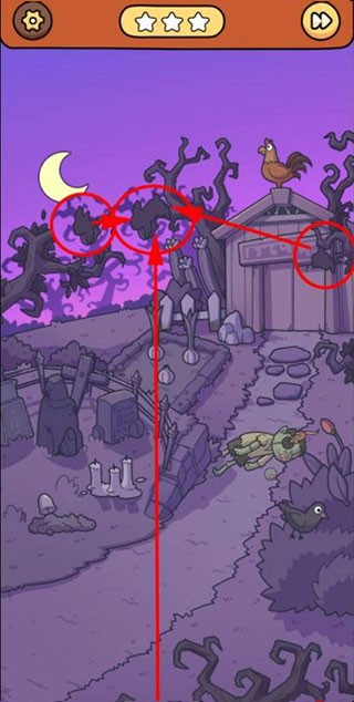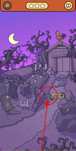 得到僵尸的腿骨后,把左上角的月亮移到畫面外。小屋的主人倒在屋門口,點擊旁邊的圖案將其收起。