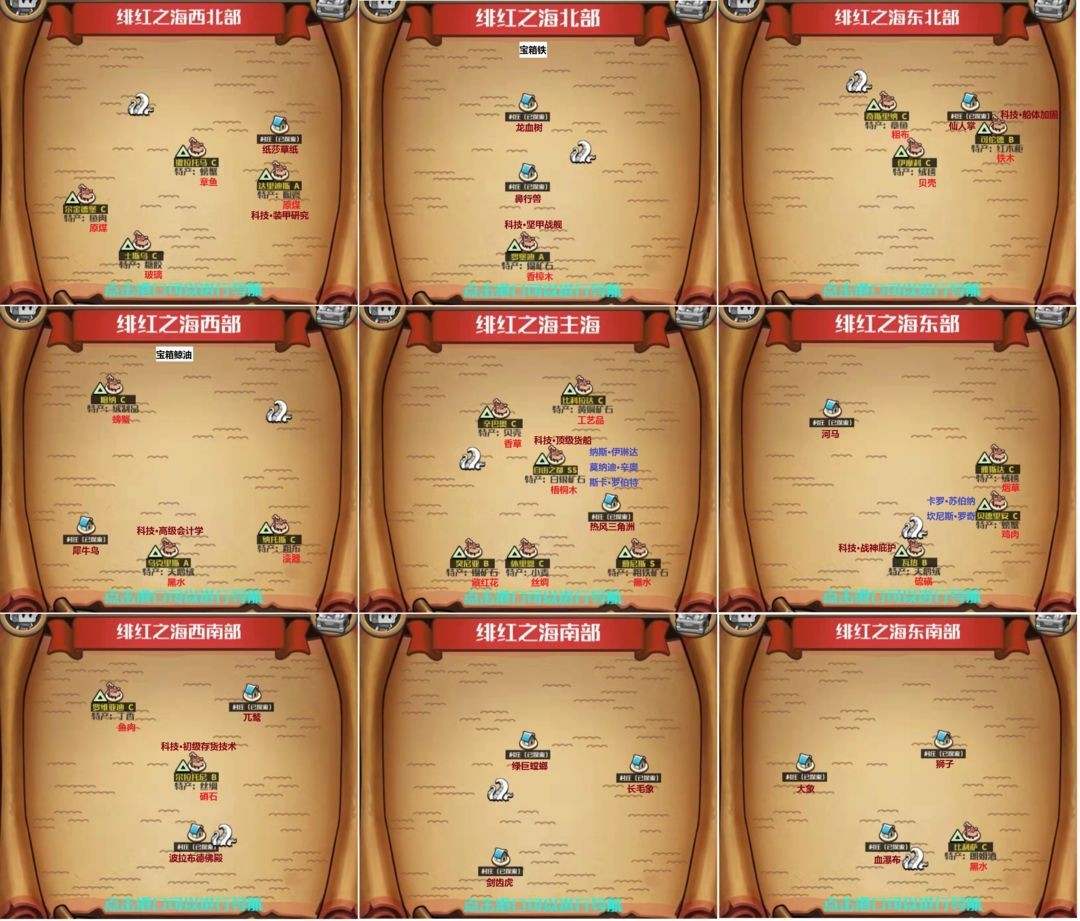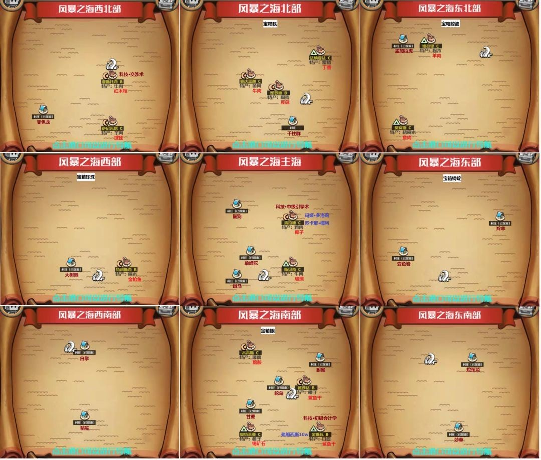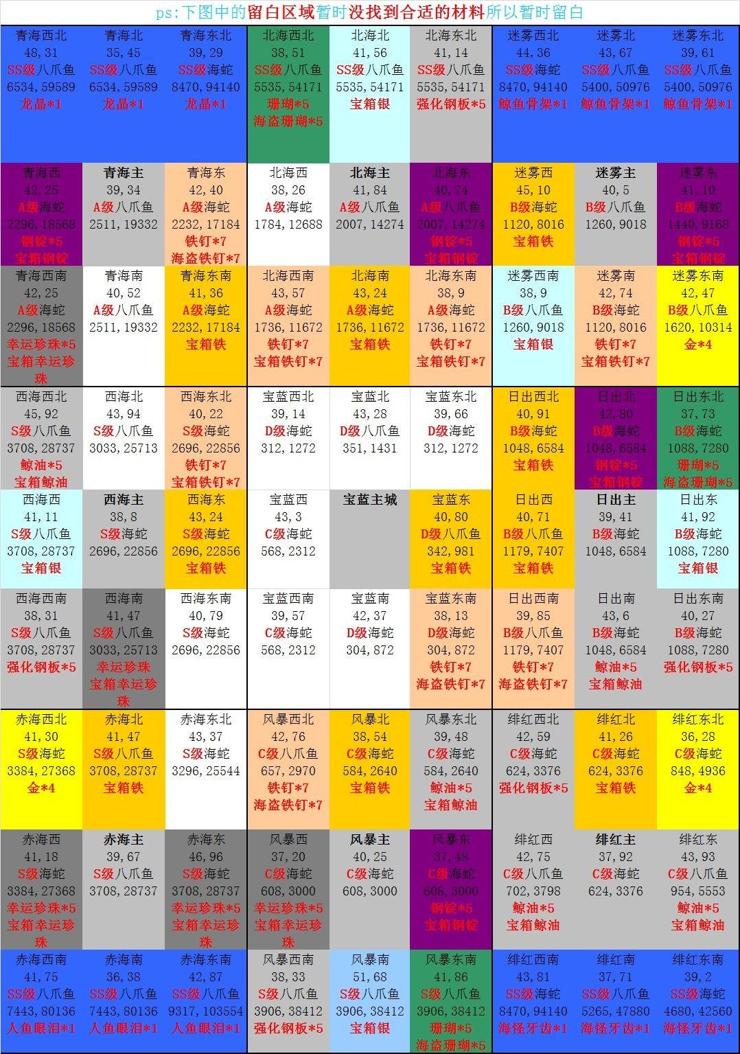 這張是之前的圖,除了八爪魚和海蛇的位置互換了,其他基本都一樣。缺什么材料可以對照著這張圖去打,建議花六塊錢買個搜刮功能,每六個月會有一次三倍戰利品的機會,用這個時機去打海怪挺合適的,海怪難度不高,而且海盜的強度和海怪的強度是成正比的。