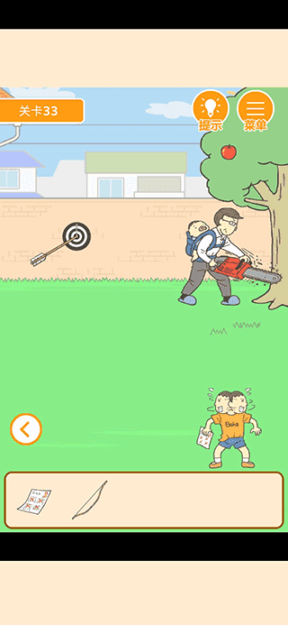 用弓箭射下蘋果,試卷擱在桌上,拿到面具。遞給小孩子。接著把鋸子也給他。