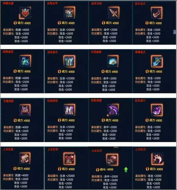 神器的附加屬性包含防御、生命、命中、攻擊與閃避這五種,且這些屬性是隨機生成的。綠色品質的神器僅帶有一條附加屬性,藍色和紫色品質的神器擁有兩條附加屬性,橙色和紅色品質的神器則具備三條附加屬性。普通玩家所穿戴的神器主要涵蓋紫色、橙色和紅色這三種品質,其中紫色神器的最高戰(zhàn)力可達2600,橙色神器的戰(zhàn)力固定為3800,紅色神器的戰(zhàn)力固定為4900。