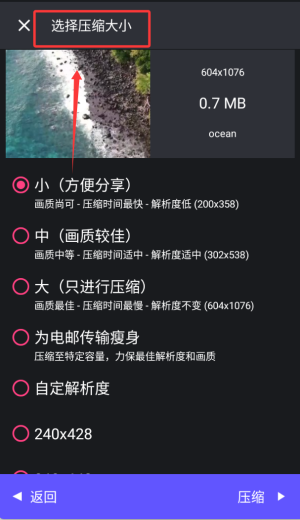 一鍵開啟視頻,挑選壓縮的尺寸,豐富的預設方案可供按需選擇來完成壓縮操作。