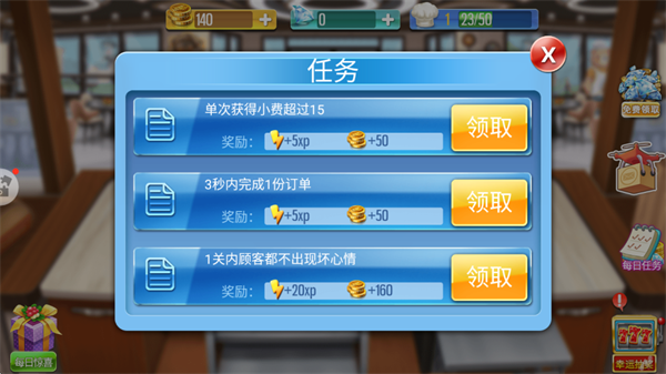 游戲目標(biāo)和時(shí)間限制會(huì)顯示在上方,我們只需在規(guī)定時(shí)間內(nèi)按顧客要求完成訂單,就能獲得小費(fèi)。